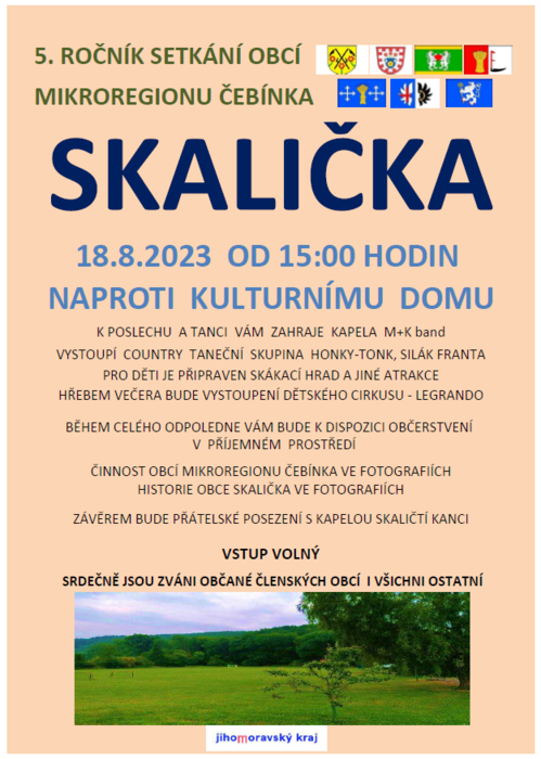 Mikroregion Čebínka srdečně zve na 5. ročník setkání obcí, které se uskuteční v pátek 18. srpna od 15: 00 hodin v obci Skalička naproti kulturnímu domu. K poslechu a tanci zahraje kapela M+K band, vystoupí country taneční skupina Honky-Tonk, Silák Franta. Pro děti je připraven skákací hrad a jiné atrakce. Vstup volný. Občerstvení zajištěno.