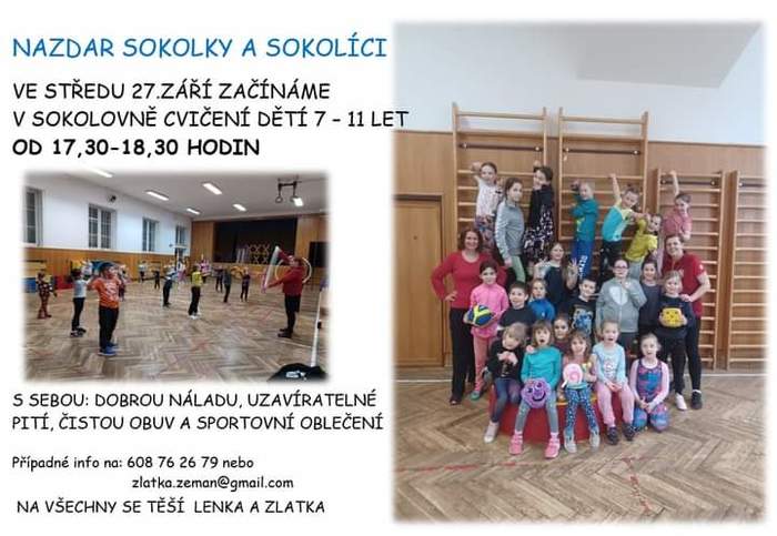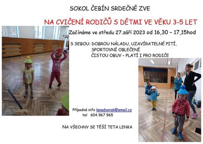 Sokol Čebín zve na cvičení rodičů s dětmi ve věku 3 – 5 let ve středu 27. září od 16. 30 hodin. V 17. 30 hodin začíná cvičení pro děti od 7 – 11 let. Bližší informace jsou uvedeny na stránkách obce a na Facebooku obce Čebín.