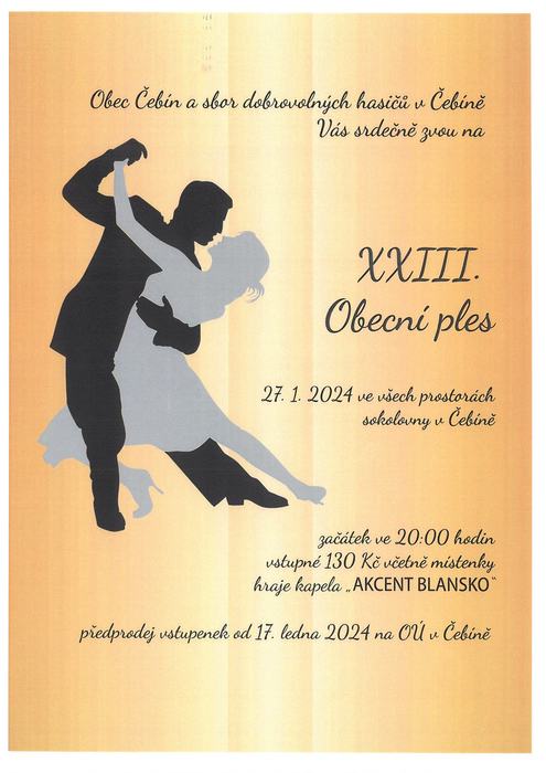 Obec Čebín a sbor dobrovolných hasičů v Čebíně Vás srdečně zve na XXIII. Obecní ples, který se koná v sobotu 27. ledna od 20:00 hodin ve všech prostorách sokolovny v Čebíně. Vstupenky je možné zakoupit na obecním úřadě.