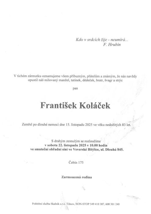 Úvod > Aktuality > Smuteční oznámení pan František Koláček