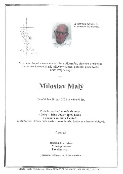 Úvod > Aktuality > Smuteční oznámení pan Miloslav Malý