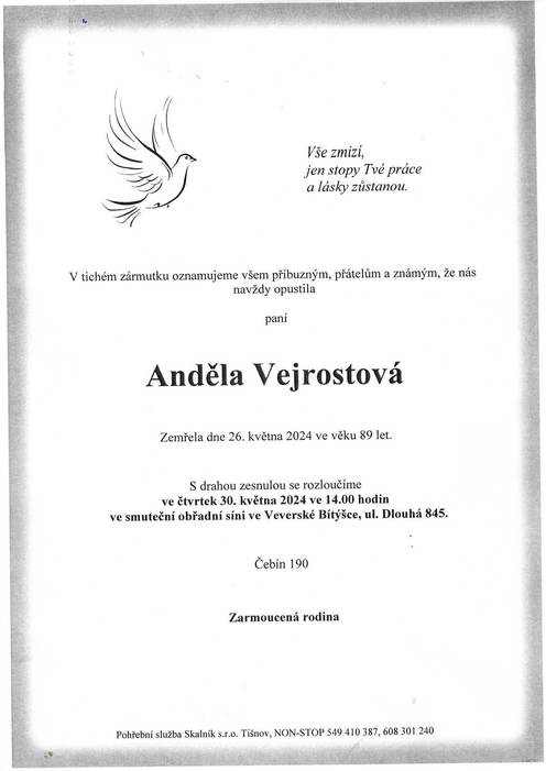 Úvod > Aktuality > Smuteční oznámení paní Anděla Vejrostová