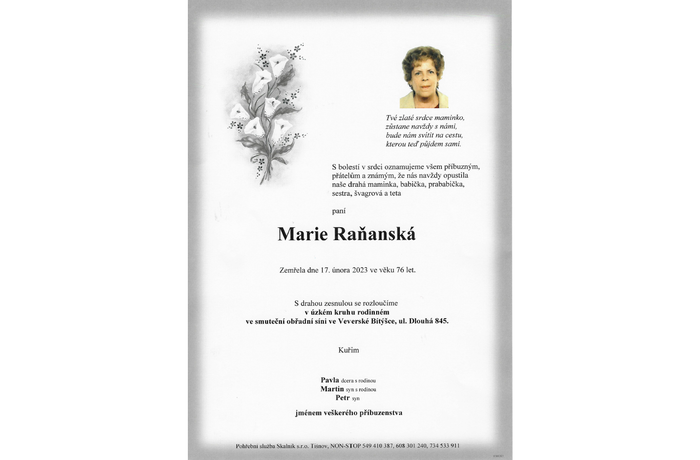 Úvod > Aktuality > Smuteční oznámení paní Marie Raňanská roz. Benýšková