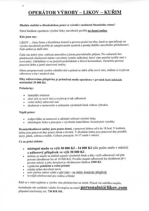 Společnost LIKOV se sídlem v Kuřimi, zabývající se výrobou stavebních profilů, aktuálně obsazuje následující pozice:
