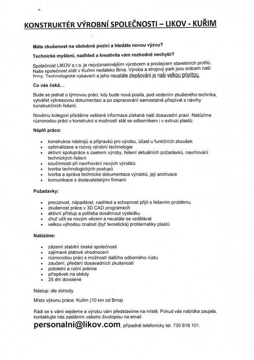 Společnost LIKOV se sídlem v Kuřimi, zabývající se výrobou stavebních profilů, aktuálně obsazuje následující pozice: